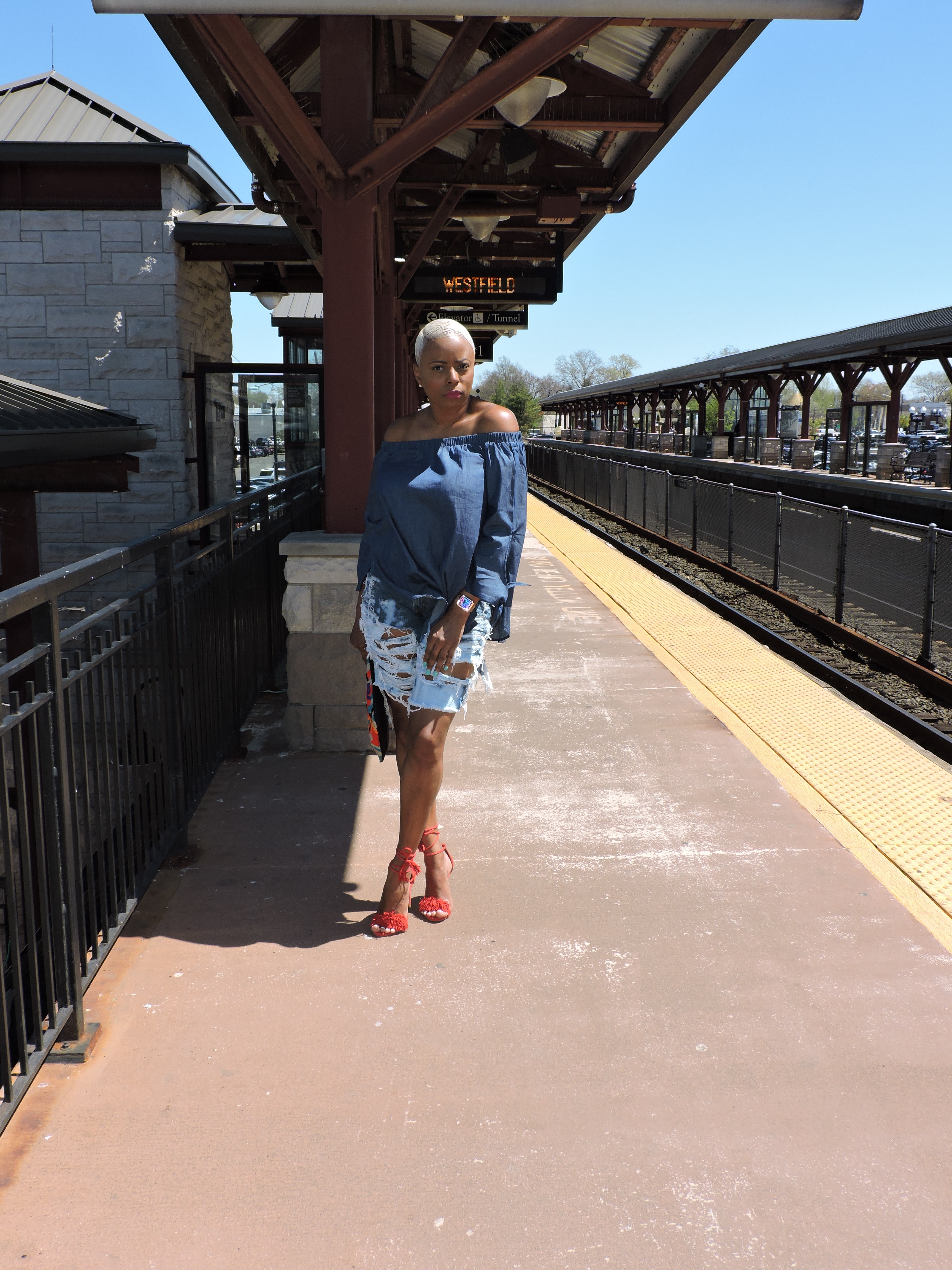 Off the shoulder top || Denim Shorts || Sandals || Clutch: Berry (Sold Out)