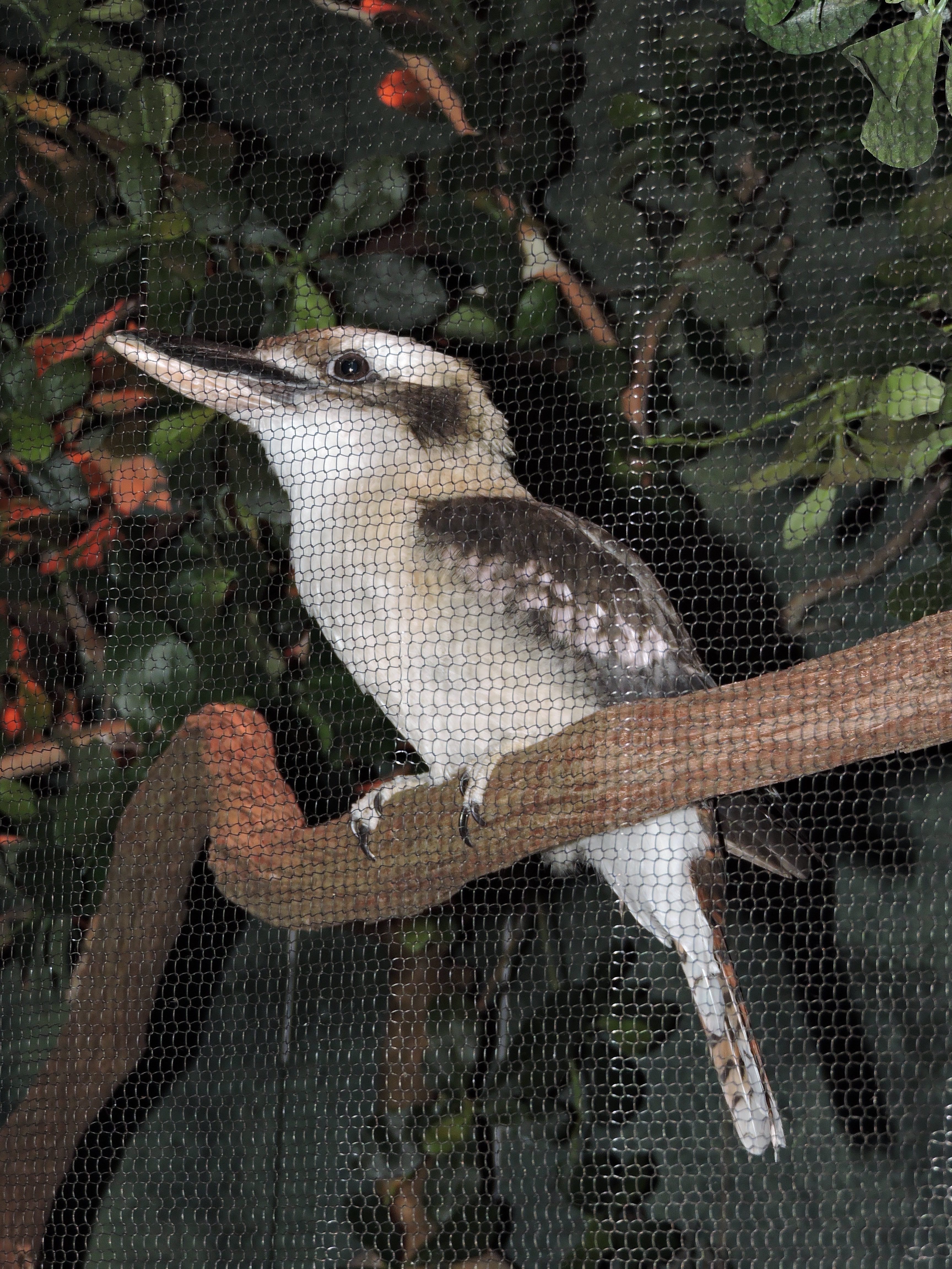 The Laughing Kookaburra is instantly recognisable in both plumage and voice. It is generally off-white below, faintly barred with dark brown, and brown on the back and wings. The tail is more rufous, broadly barred with black. There is a conspicuous dark brown eye-stripe through the face. It is one of the larger members of the kingfisher family.